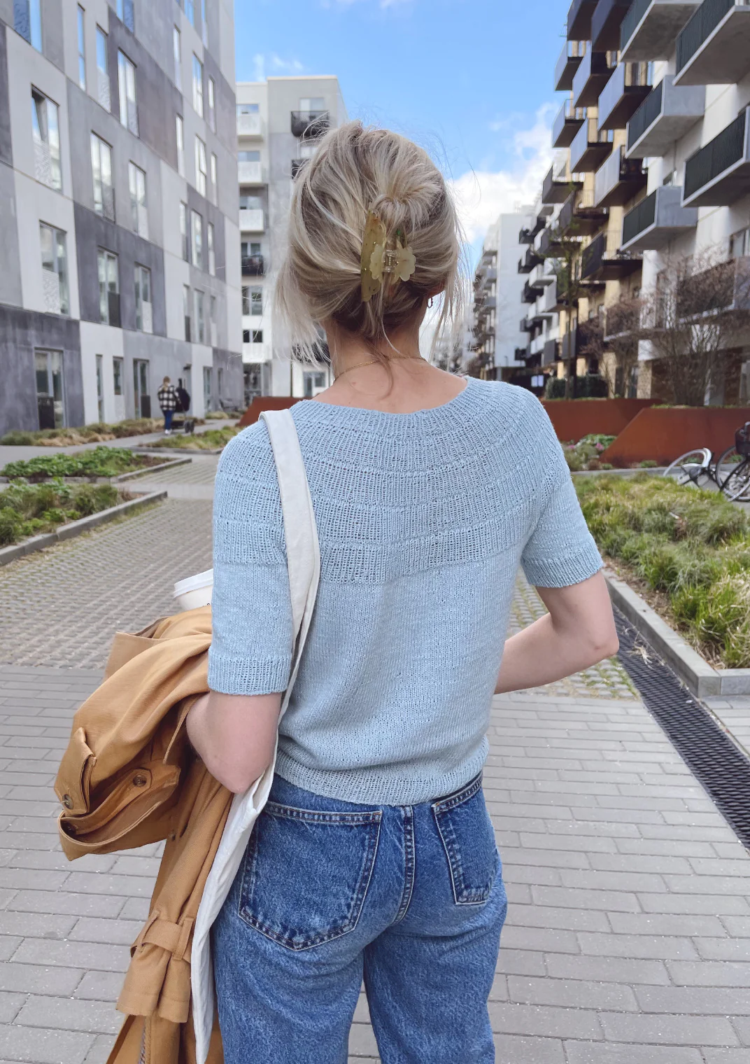 Anker Tee strikkes ovenfra og ned. Bærestykket består av segmenter med ribbestrikk etterfulgt av klassiske raglanøkninger. Ermene strikkes til slutt på strømpepinner eller med Magic Loop-teknikk. Anker Tee er monteringsfri.