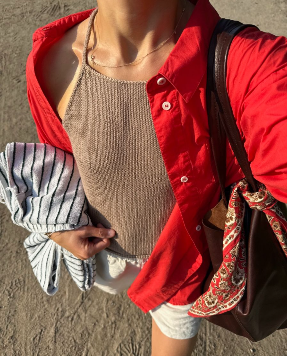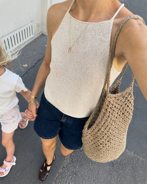 Den kobberfargede Audrey Top er strikket i Hør Organic fra Isager i fargen Nougat.