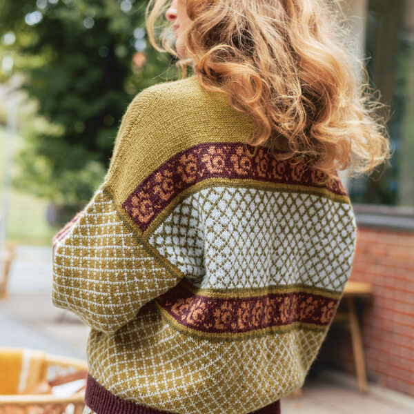 Den gulbrune genseren er strikket i disse fargene: 2152 Vintage Gold, 9873 Dark Olive, 5811 Artic Ice, 4372 Dyp Burgunder, 3535 Lys Kobberbrun