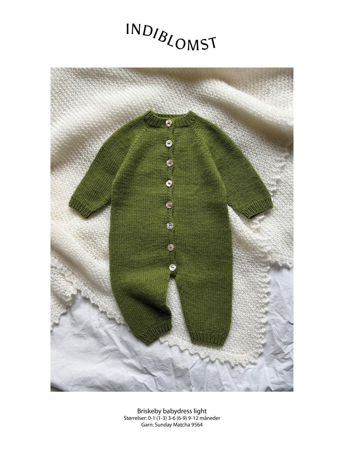 En behagelig og lett dress til de minste. Briskeby babydress Light strikkes ovenfra og ned i glattstrikk med raglankonstruksjon. Bærestykket og kroppen strikkes frem og tilbake på rundpinne, mens ermer og ben strikkes rundt på settpinner.