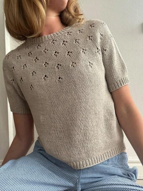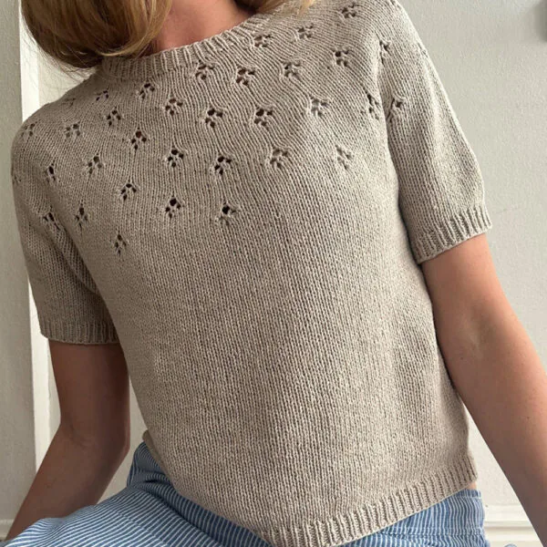 Clover Tee har et lite, fint og enkelt kløvermønster på det runde bærestykket, men er ellers helt enkel i glattstrikk og med smale ribbekanter. Fordi Clover Tee strikkes ovenfra og ned, bestemmer du selv lengden på ermer og bol. Vendepinnene øverst, gjør at halsen får en fin passform.