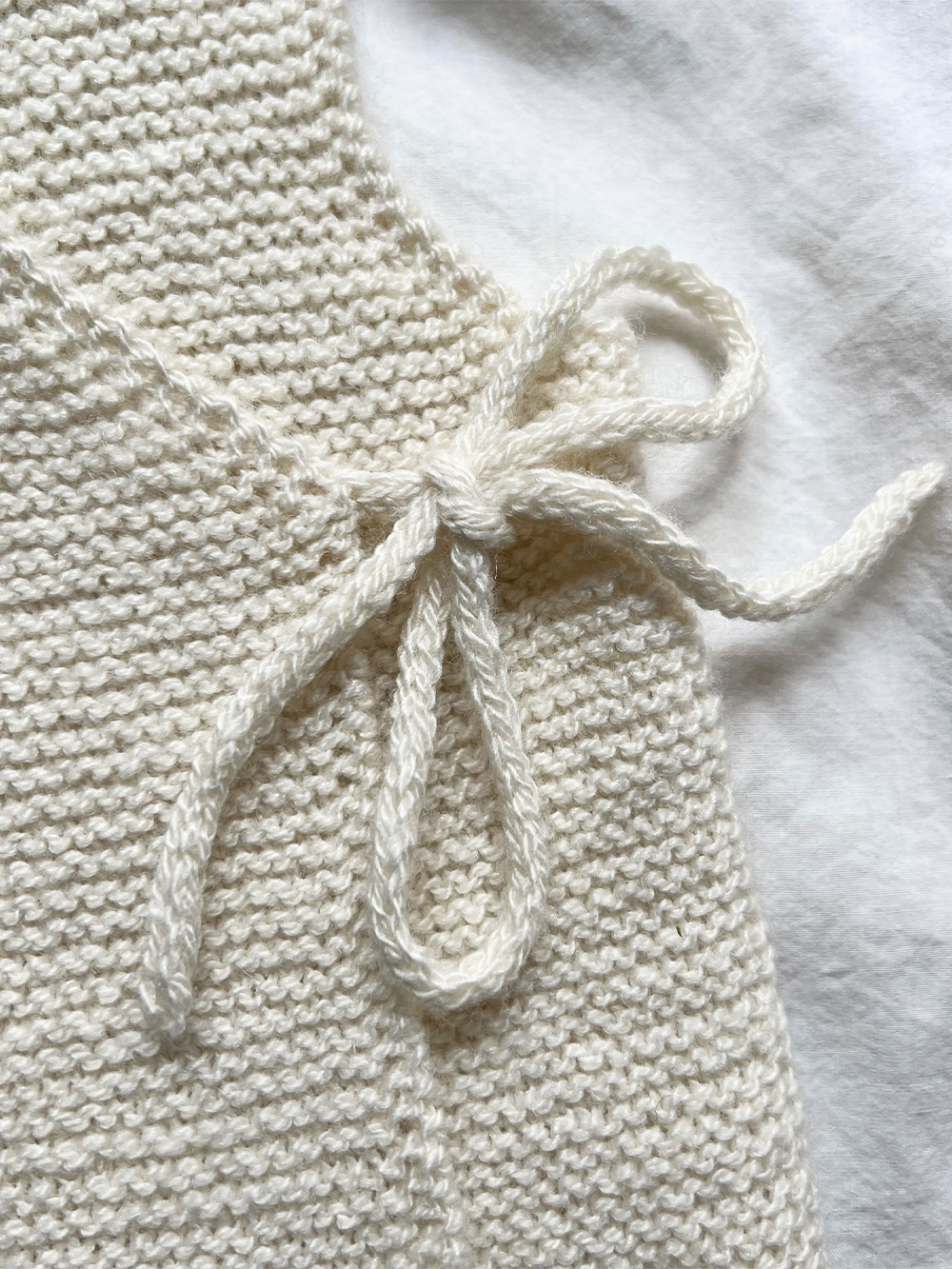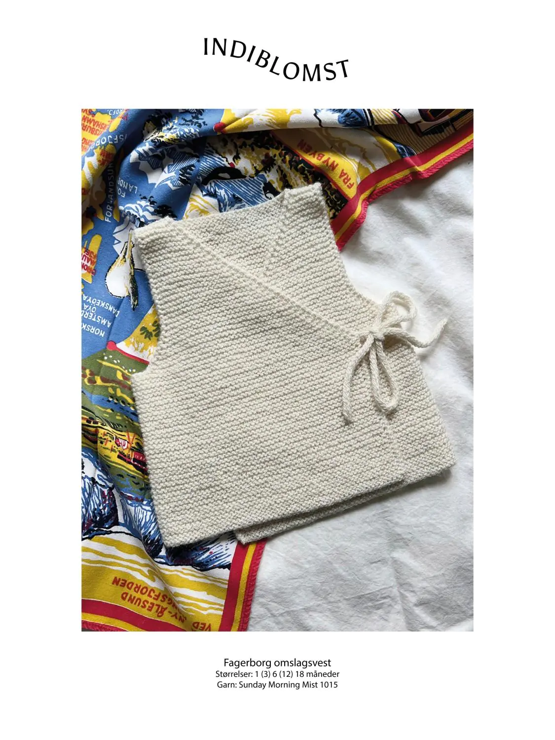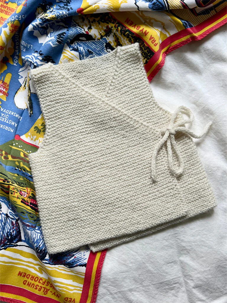 Fagerborg omslagsvest strikkes ovenfra og ned, frem og tilbake i rillestrikk på en lang rundpinne. Vesten lukkes med i-cord knytesnorer i Sunday.