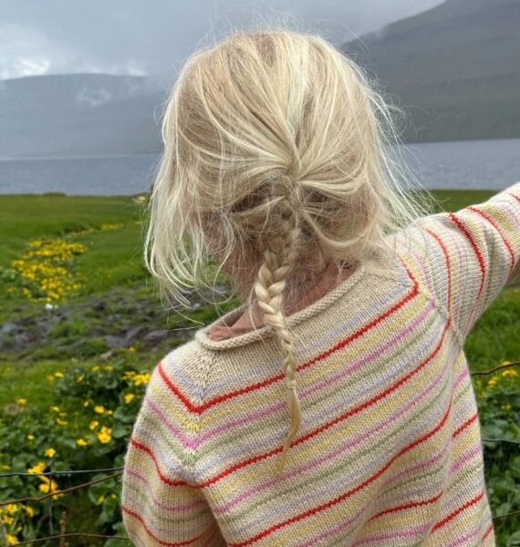 Frankie Sweater Junior strikkes ovenfra og ned med raglanøkninger på bærestykket. Det strikkes vendepinner i nakken for å forme halsutskjæringen. Ermene strikkes rundt med strømpepinner eller med Magic Loop-teknikk. Frankie Sweater Junior strikkes med smale striper i flere farger eller i én enkelt farge.