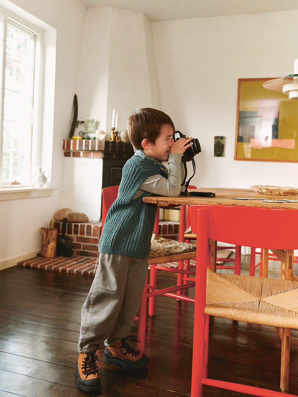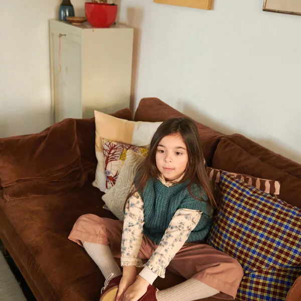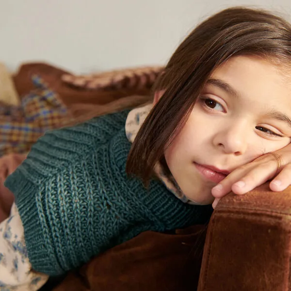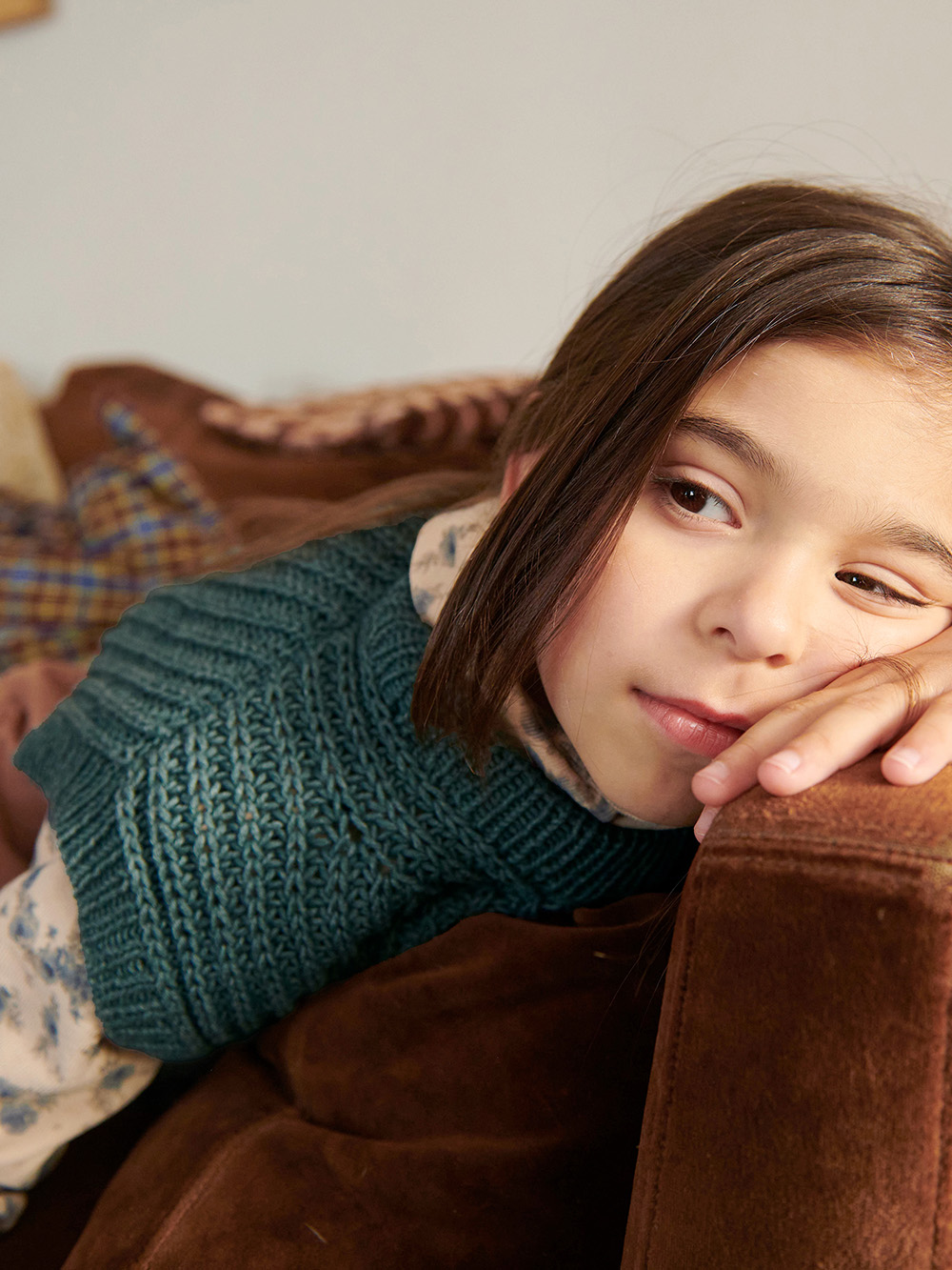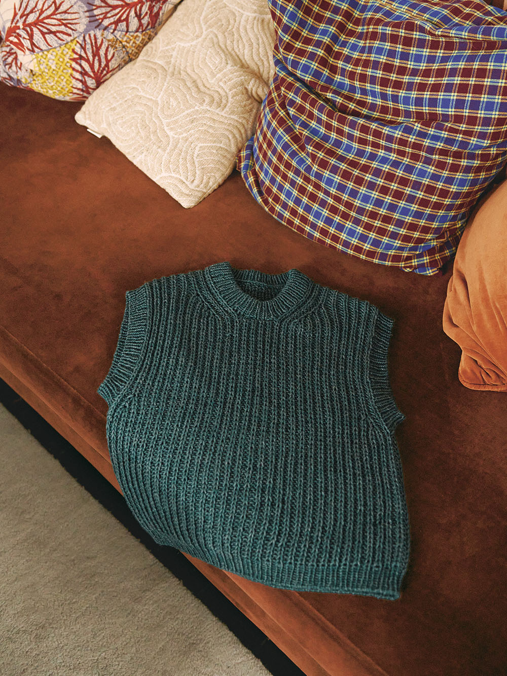 Loui Slipover Junior er et anvendelig plagg som passer både alene og over skjorte eller genser. Slipoveren strikkes ovenfra og ned i halvpatent og strikkes i Merinoull.