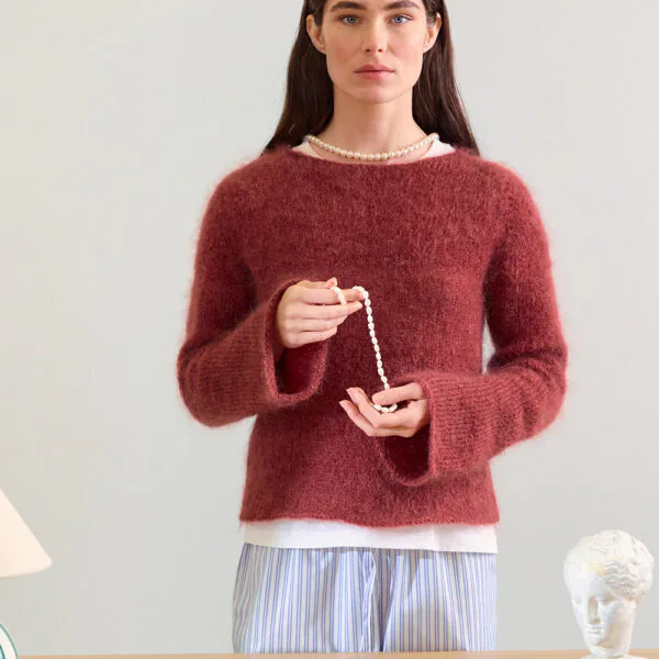 Lyra Sweater i Ballerina Chunky Mohair kan strikkes både ovenfra og ned og nedenfra og opp. En tettsittende raglangenser med formet hals og ermer med trompetfasong.