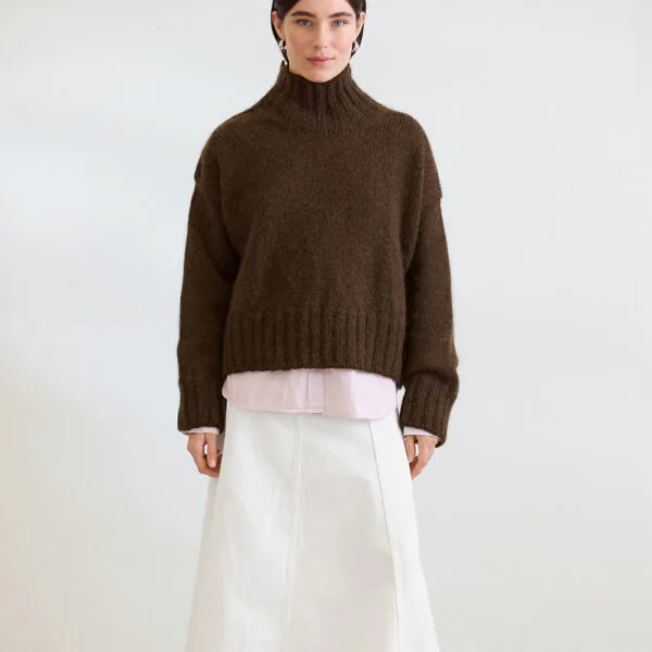 Genser strikket ovenfra og ned med én tråd Peer Gynt kombinert med Tynn Silk Mohair. Dekorativ knappedetalj langs skulder og hals, glattstrikkede ermer og vrangbordavslutning.
