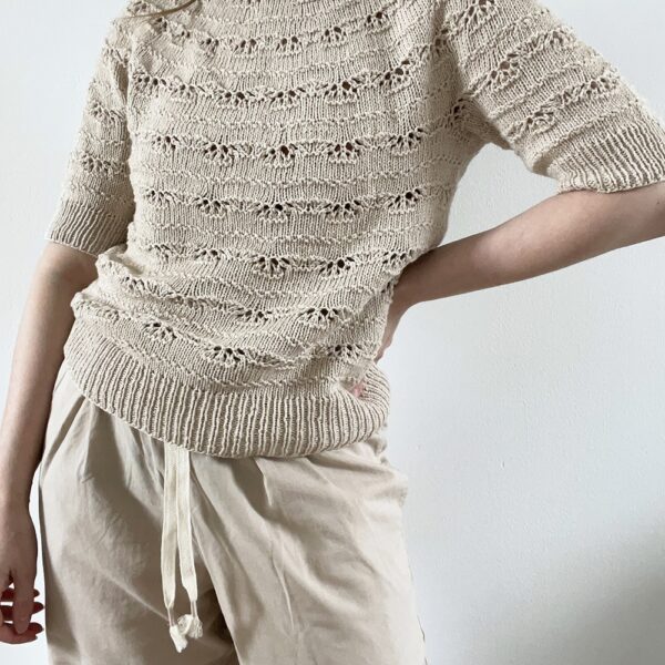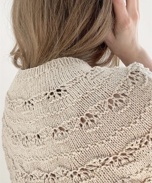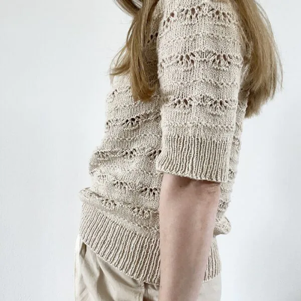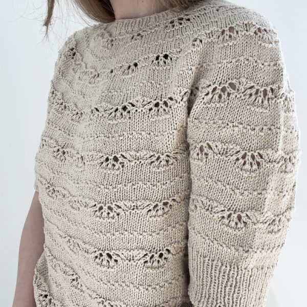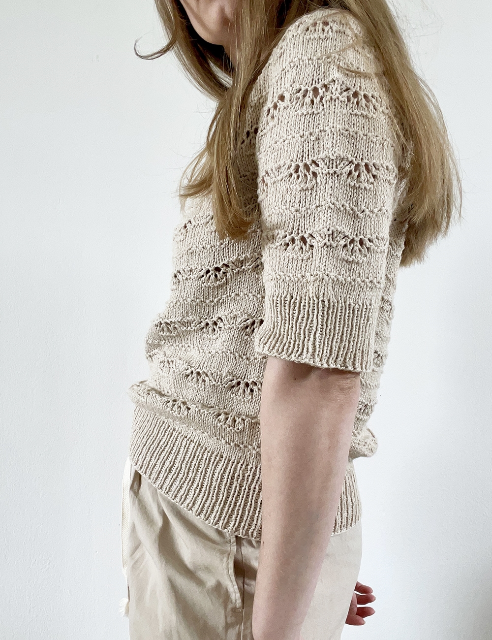 Den delikate borden på Musling Tee ligner små skjell på rad og rekke, og mønsteret trer så fint frem i et garn med lin og bomull. Musling Tee strikkes ovenfra, så du bestemmer selv lengden på ermer og bol. Det er vendepinner øverst for en bedre passform.