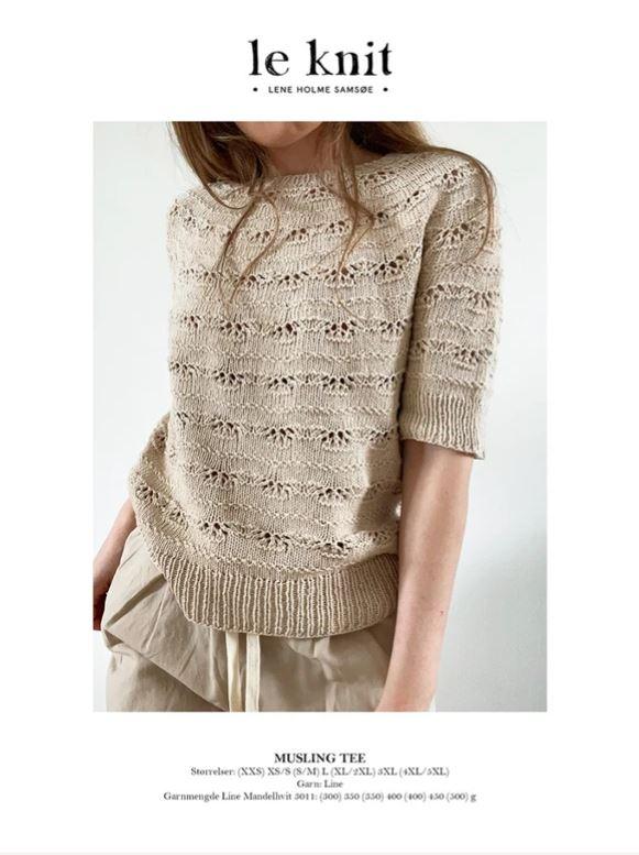 Musling Tee strikkes ovenfra og ned. Etter halskanten strikkes vendepinner, så halsutringningen blir dypere foran enn bak. Deretter strikkes det runde bærestykke, og bol og ermer strikkes ferdig for seg.