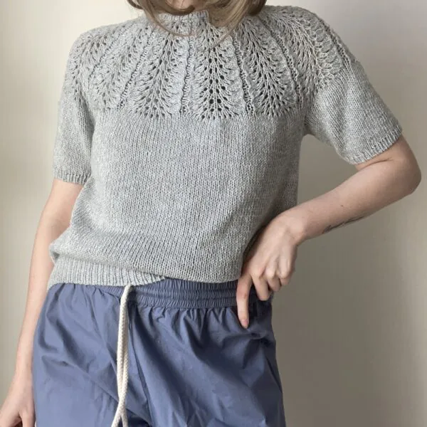 Palme tee har et nydelig hullmønster på det runde bærestykke. Den strikkes ovenfra og ned.