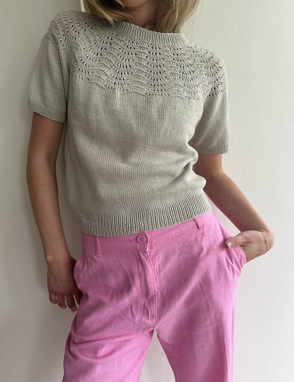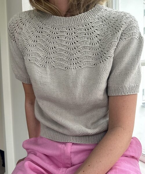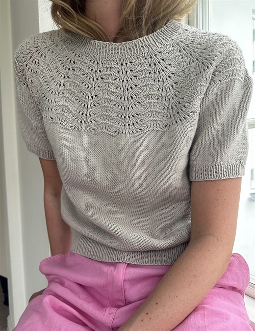 Peacock shirt strikkes oppefra, og halsudskæringen dannes ved hjælp af vendepinde efter halskanten er strikket. De enkle kombinationer af hulmønster og vrangmasker på bærestykket danner en delikat struktur, der samtidig er nem og underholdende at strikke.