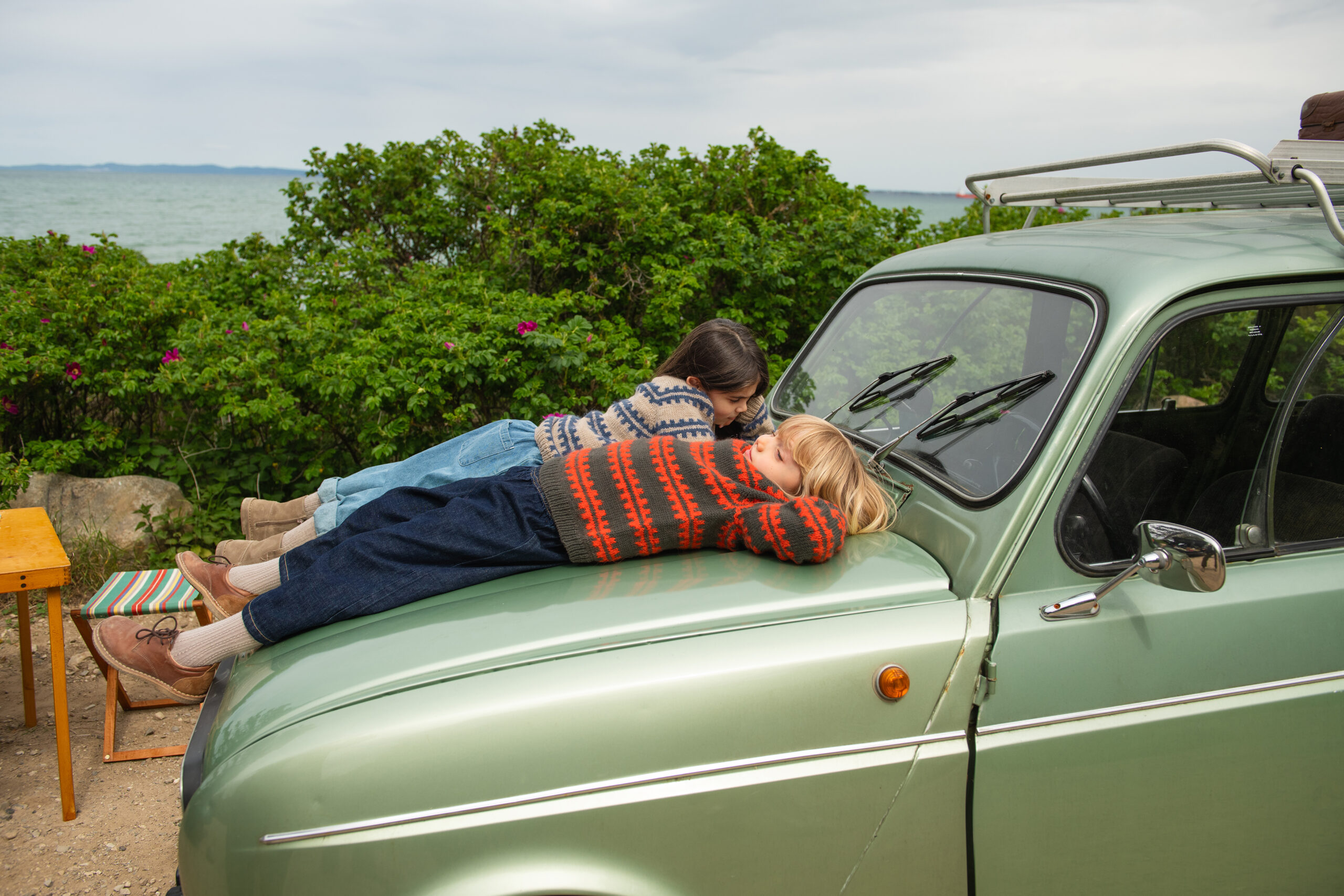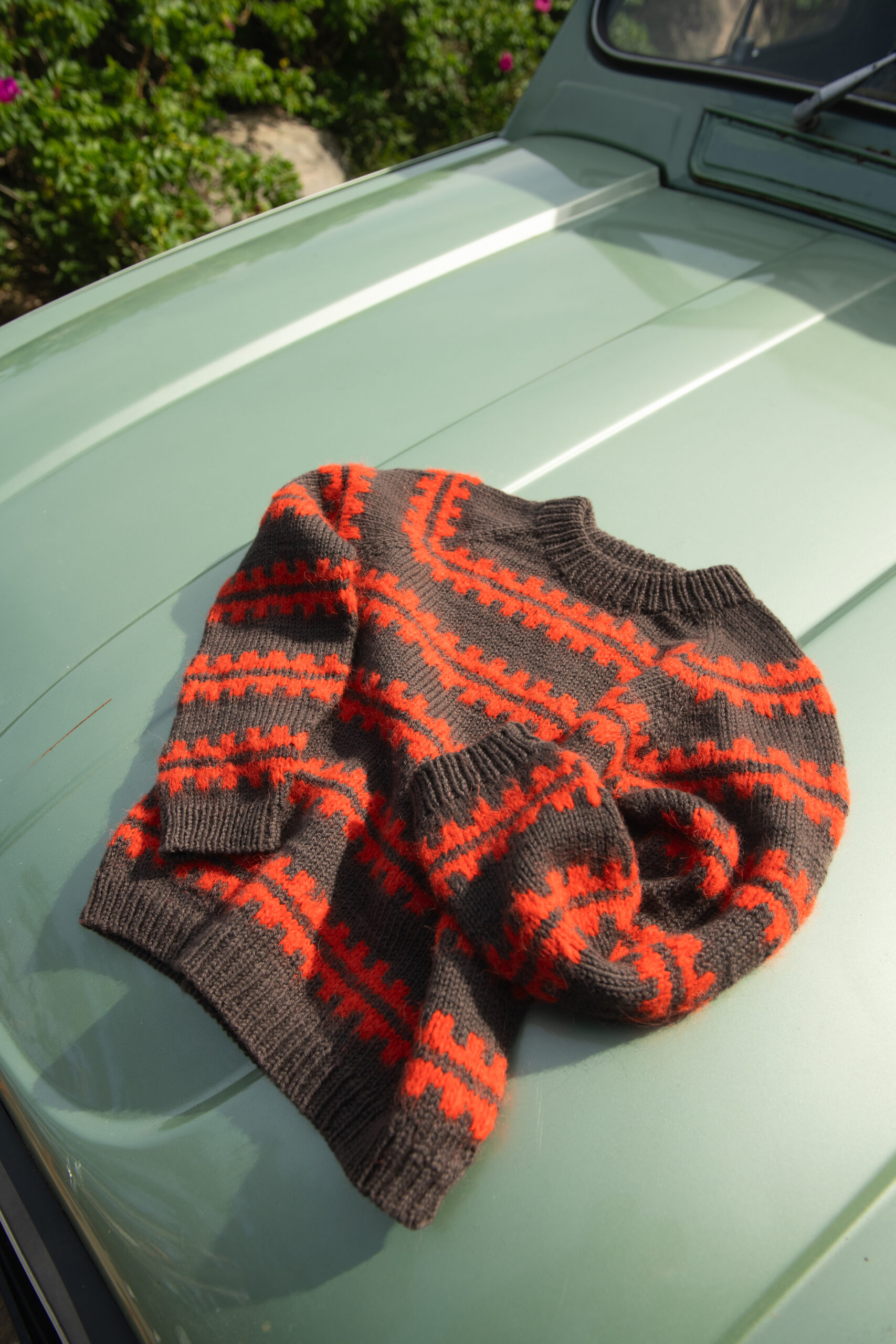 Det legges opp masker til bærestykket som strikkes frem og tilbake med økninger til raglan og halsutringning. Når økningene til halsutringning er ferdig tas arbeidet sammen, og det strikkes rundt med raglanøkninger og mønster etter diagram. Når alle maskene er økt ut deles arbeidet til ermer, for- og bakstykket, og delene strikkes ferdig hver for seg. Halskanten strikkes til slutt.