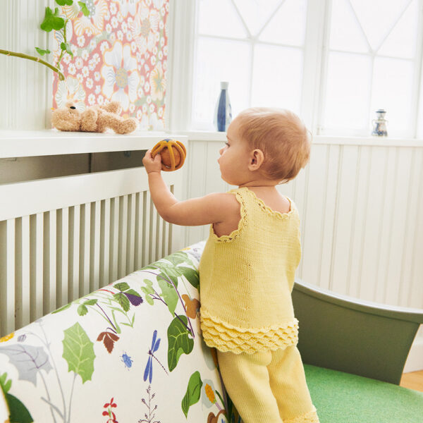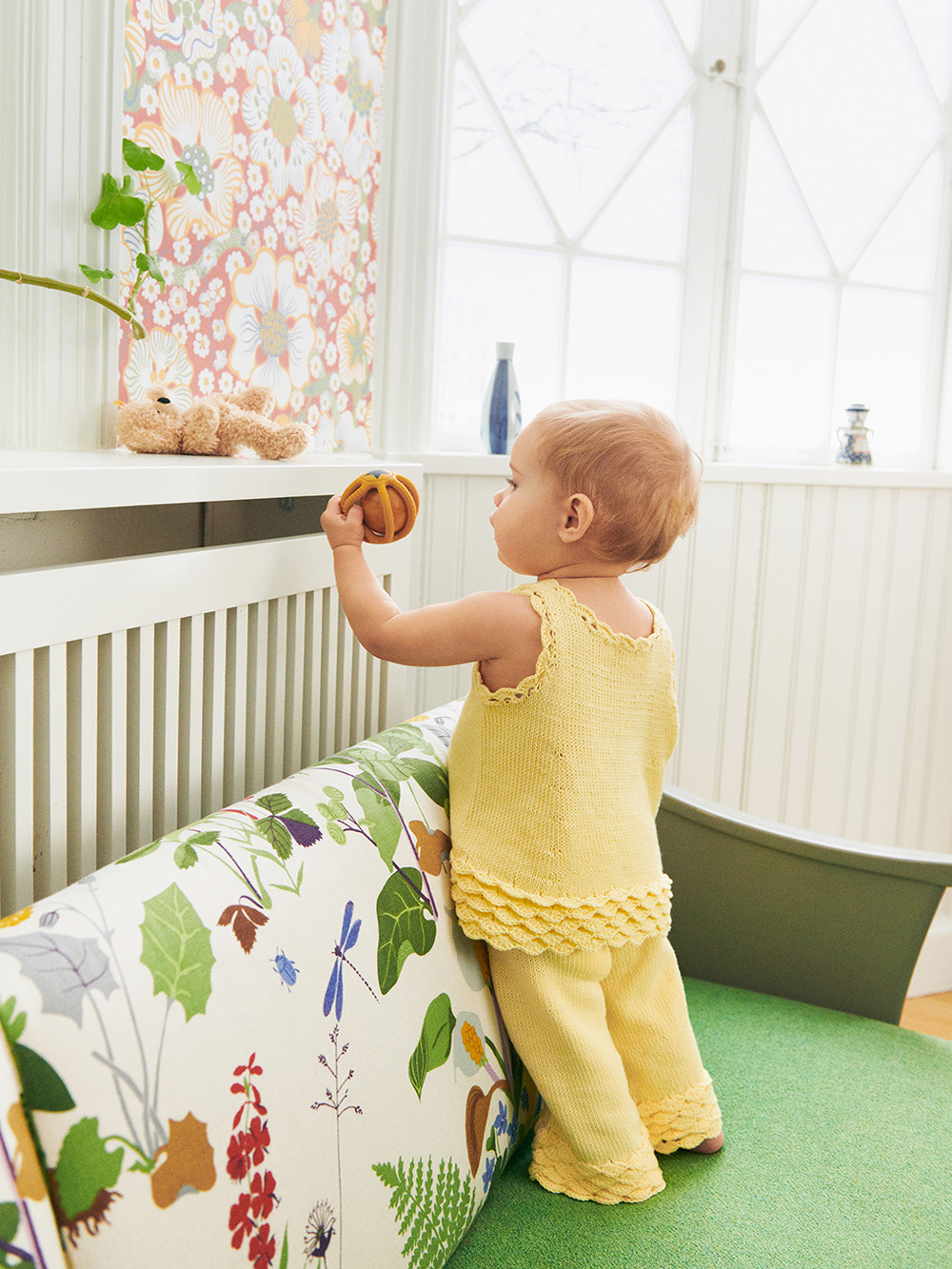 Topp strikket ovenfra og ned med A-fasong og heklede tungekanter for et søtt og sommerlig uttrykk.