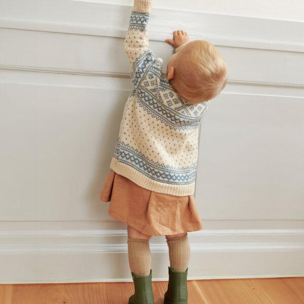Setesdal kofte baby i Babyull Lanett er en tradisjonsrik kofte med fine lus og klassisk mønsterbord øverst. Den strikkes nedenfra og opp, og resultatet blir en varm og myk liten kofte med ekte norsk særpreg.