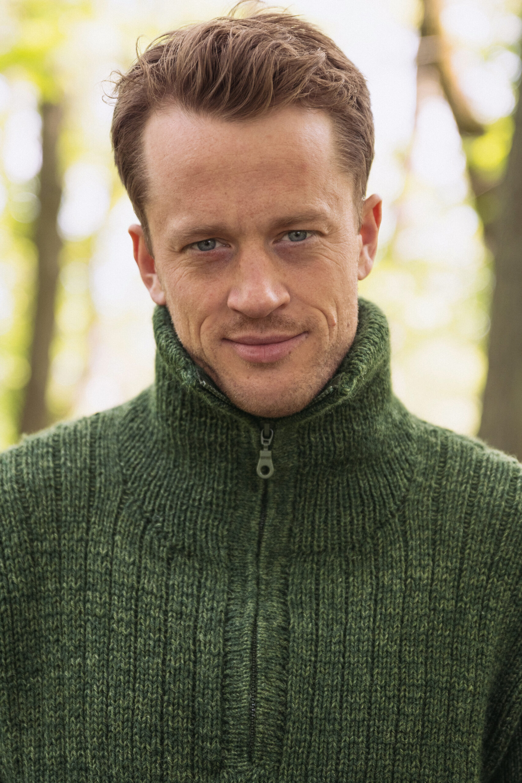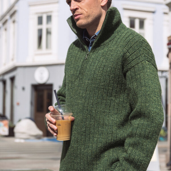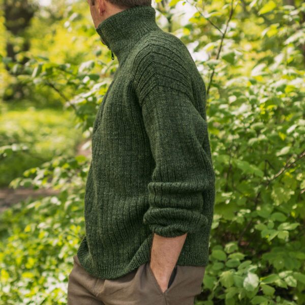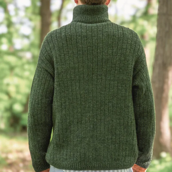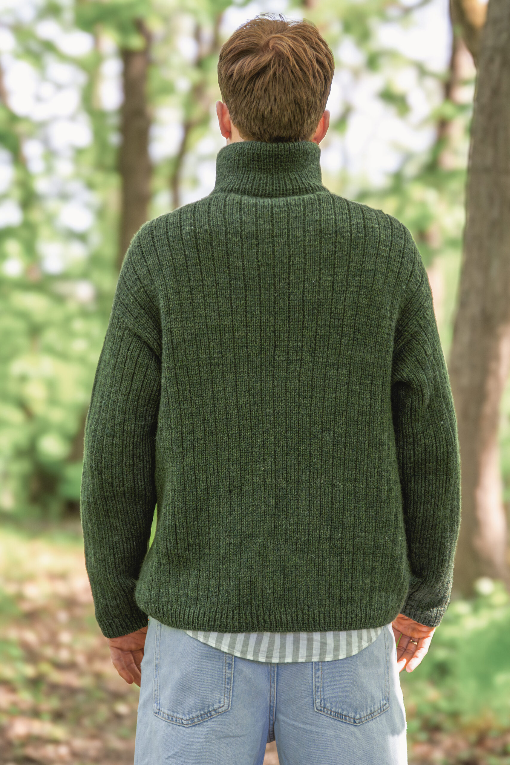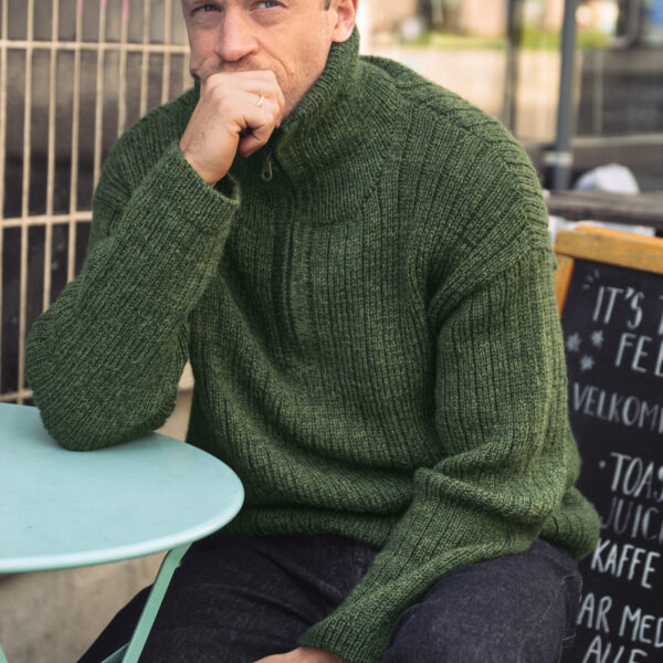 Genseren strikkes ovenfra og ned i ribb med dobbel tråd Tynn Peer Gynt.