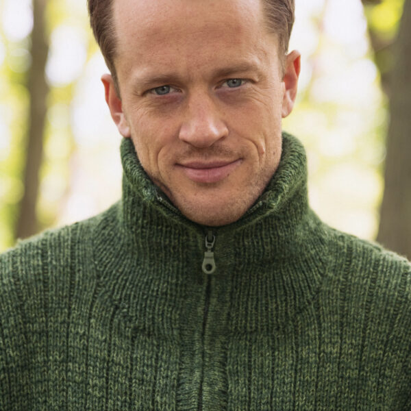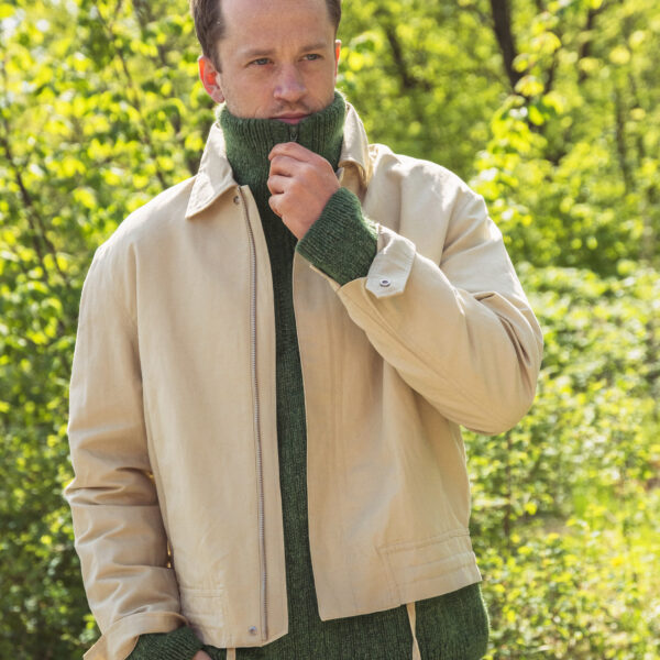 Halskanten strikkes til slutt i vrangbord frem og tilbake. Det strikkes vendepinner på venstre og høyre side av halskanten, slik at den er høyere foran enn bak. Den brettes ned mot vrangsiden og det strikkes frem og tilbake med fellinger over forkanten for å følge den dypere halsutringningen. Det strikkes opp masker langs sidene på forstykkene hvor glidelåsen skal monteres. Glidelås sys fast til slutt.