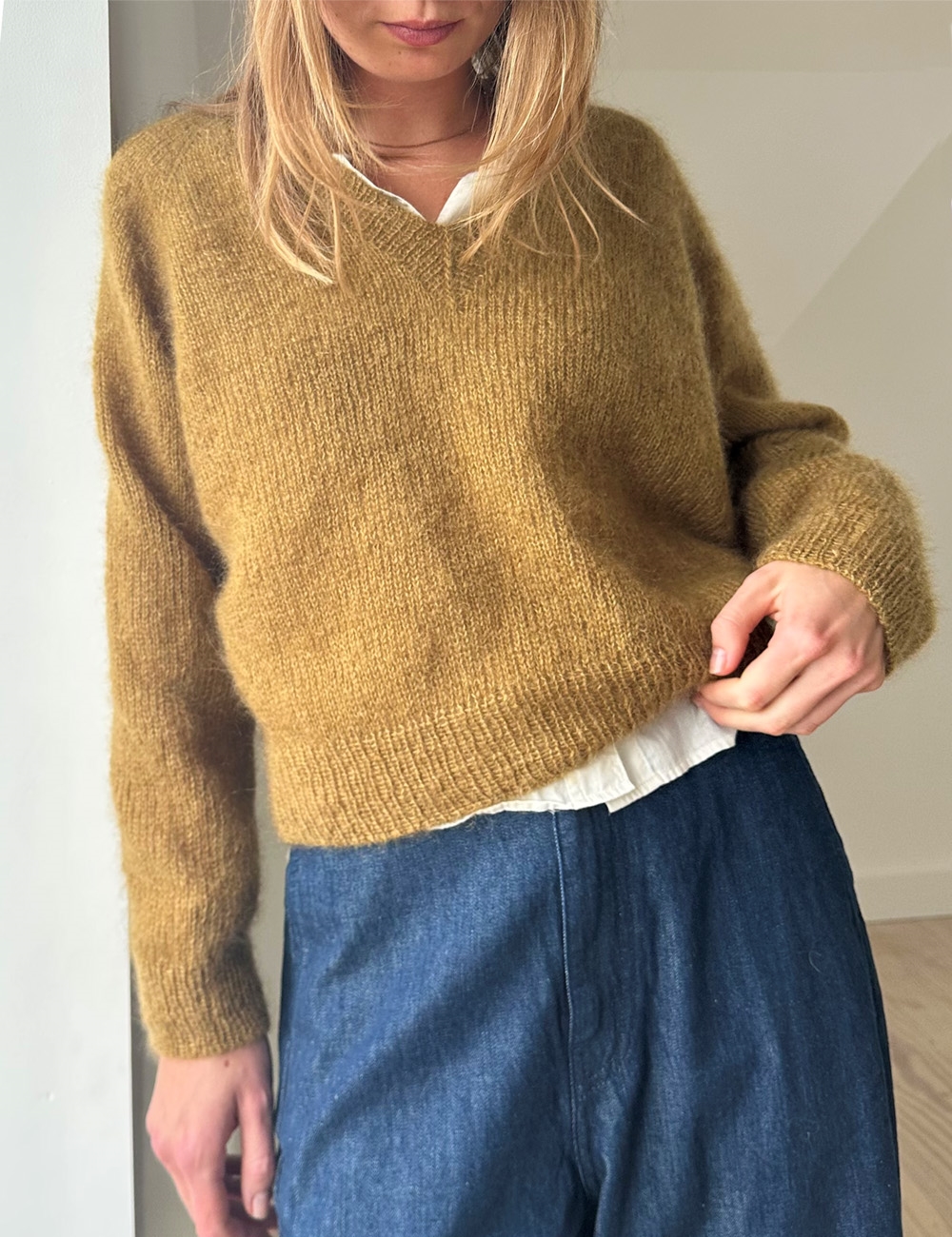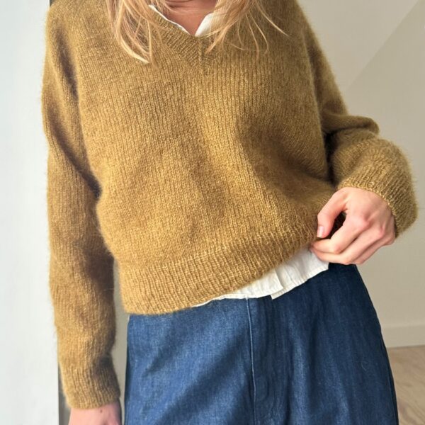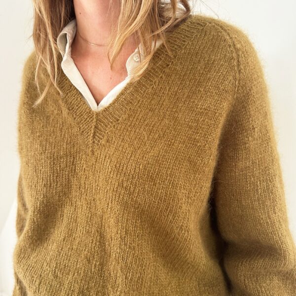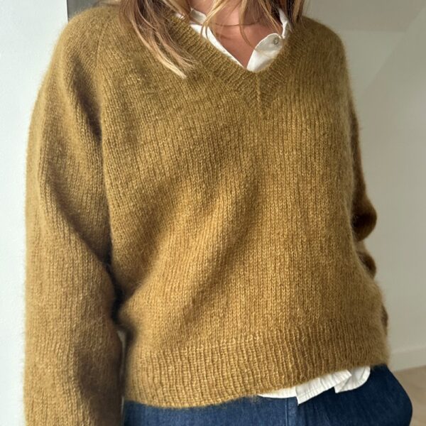 Vega har V-hals og en raglanfasong som er ekstra fin, fordi det økes forskjellig på ermer og for-/bakstykke.